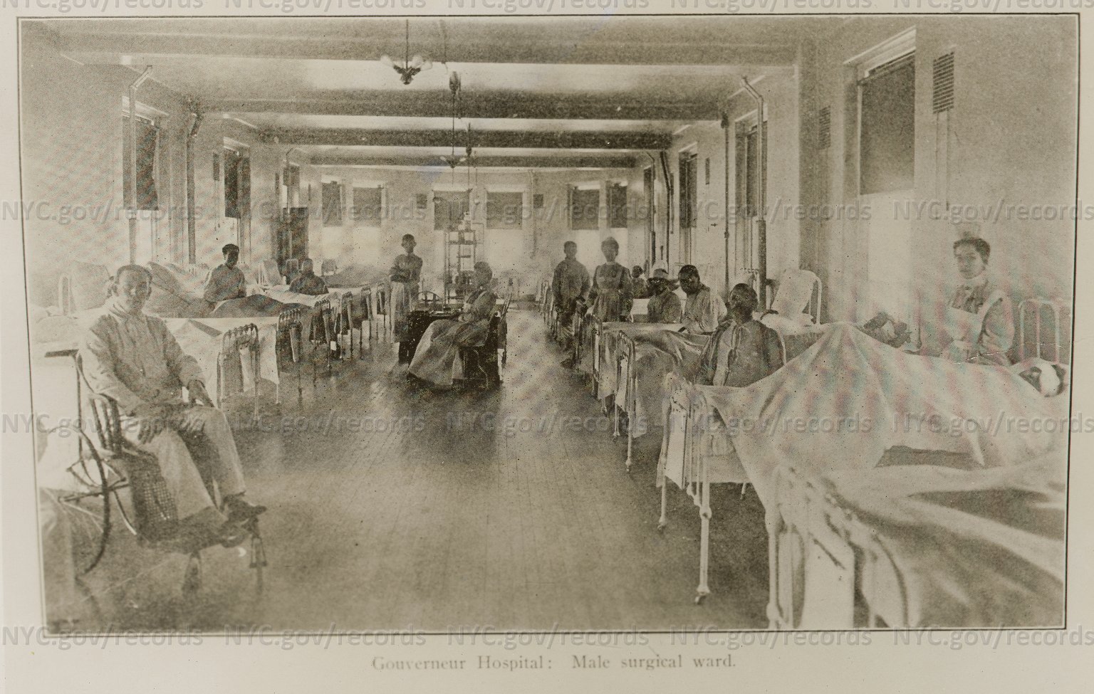 Gouverner Hospital Male Surgical Ward. Patients, mostly sitting up, and several nurses. May, 1902. NYC Dept. of Records. Link to Illustration Current 1/11/17
