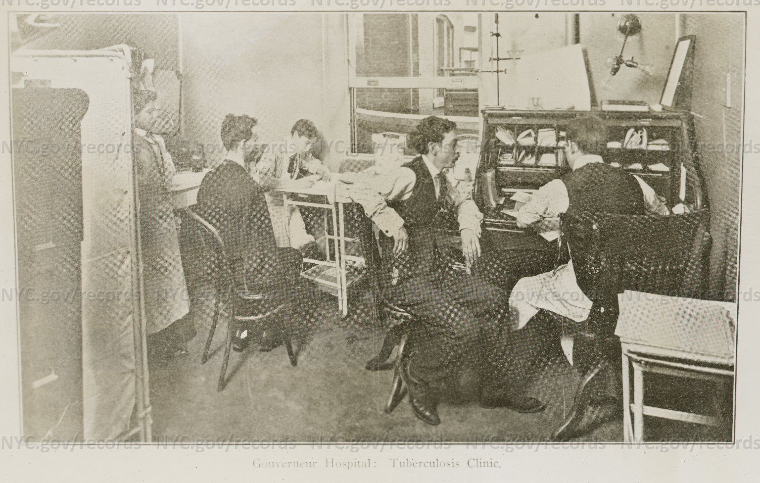 Gouverneur Hospital Tuberculosis Clinic. Seated patient with man at desk taking notes. Another patient background. May, 1902. NYC Dept. of Records. Link to Illustration Current 1/11/17