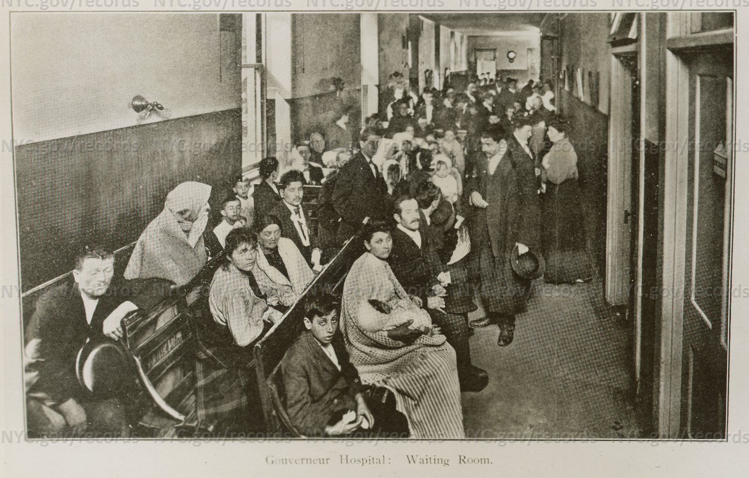 Gouverneur Hospital Waiting Room: Patients crowded on benches, some standing, in hallway. May, 1902. NYC Dept. of Records Link to Illustration Current 1/11/17