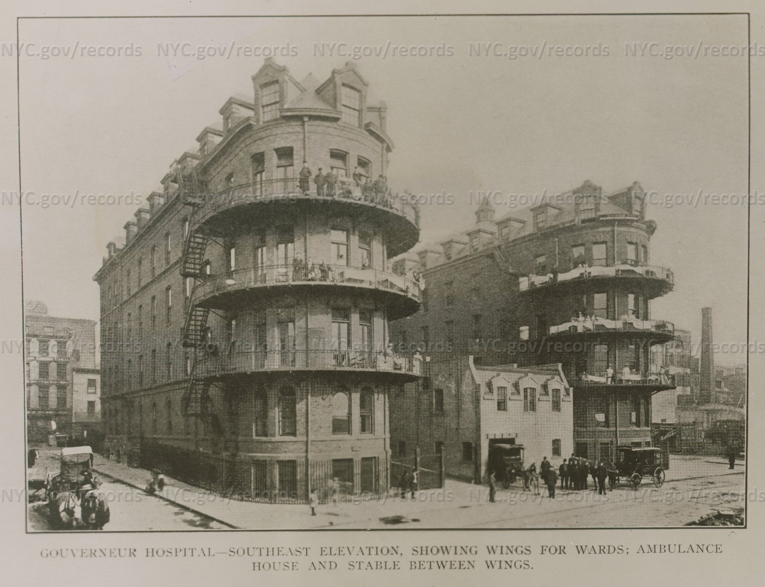 Gouverneur Hospital. Southeast elevation. Showing wings for wards. Ambulance house and stable between wings. 1907-1910. NYC Dept. of Records. Link to Illustration Current 1/11/17