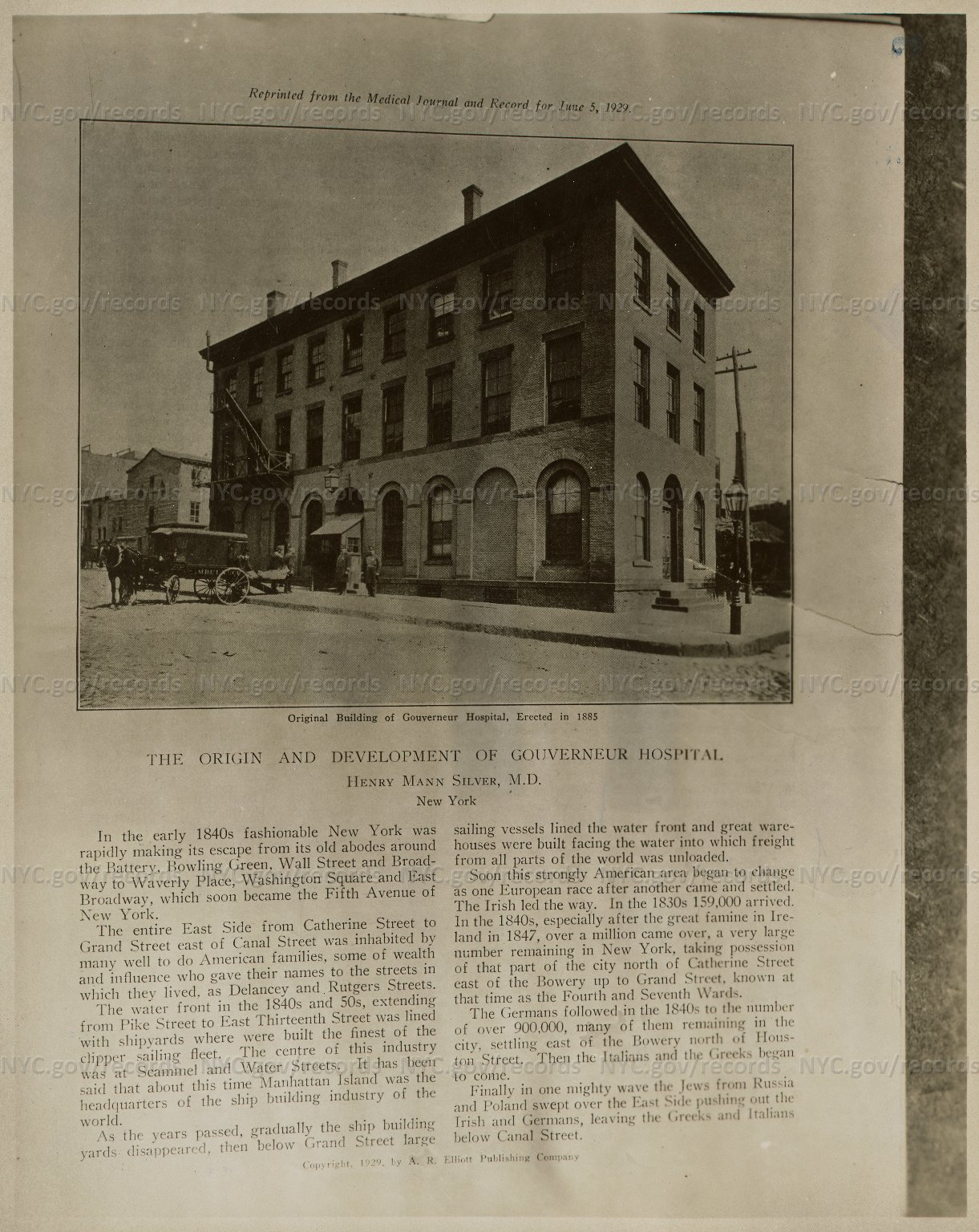 Gouverner Hospital, Original building of Gouverneur Hospital (formerly a market) on Gouverneur Slip, erected in 1883. Horse-drawn ambulance. NYC Department of Records. Page from Medical Journal & Record 6/5/1929 Link to Illustration Current 1/11/17