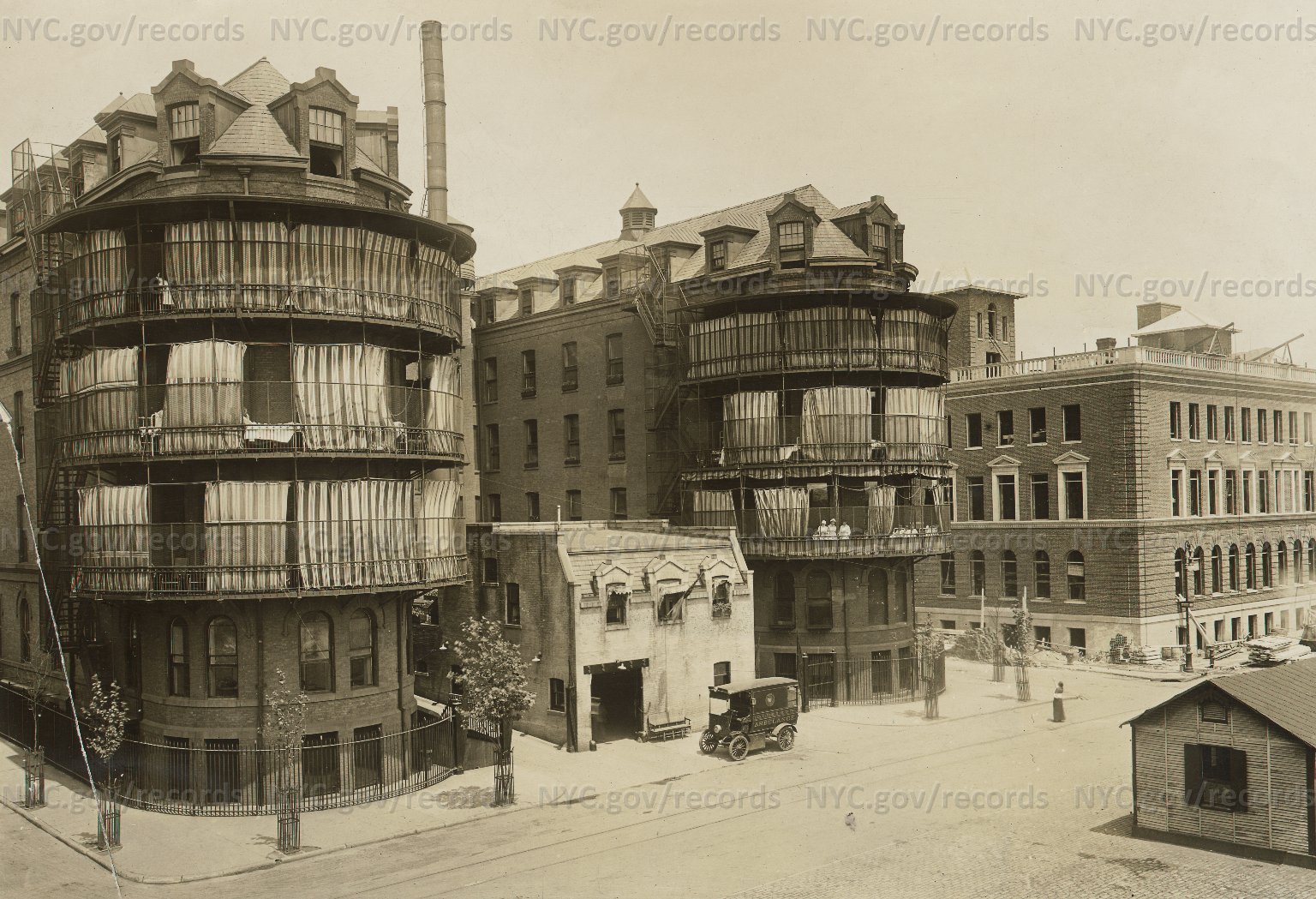Gouverneur Hospital: Patients on curved verandas with protective shades. Ambulance garage center; dispensary at R. 1913-1917. NYC Dept of Records. Link to Illustration Current 1/11/17